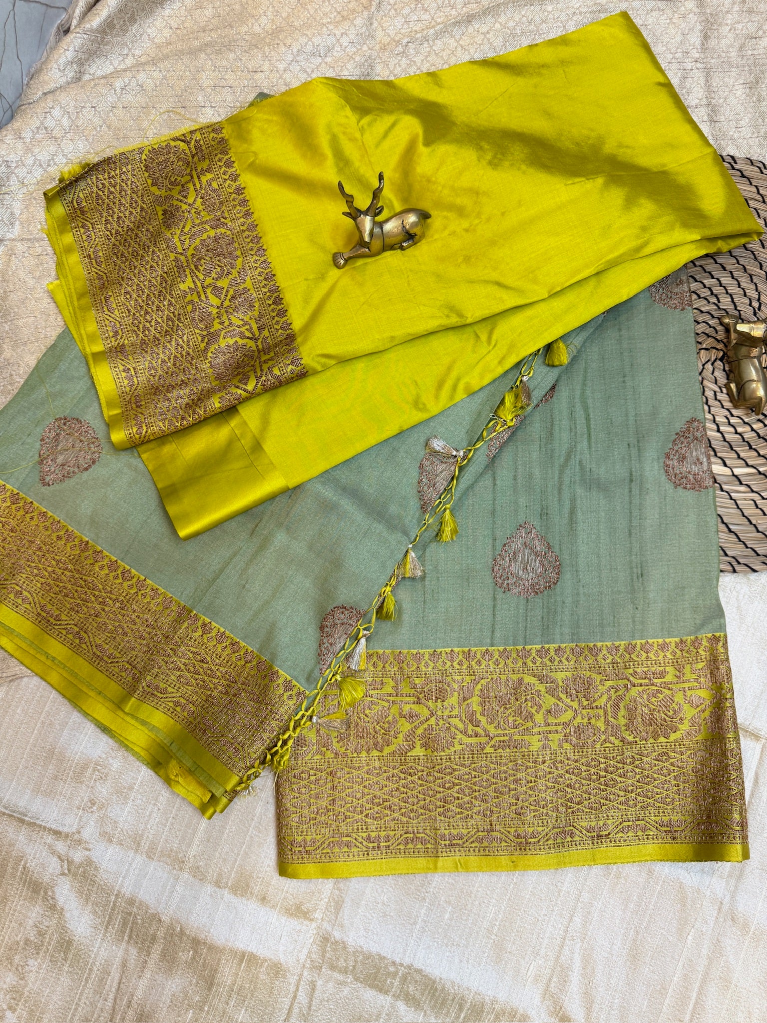Banarasi Tussar Silk Saree Butta Green with yellow border