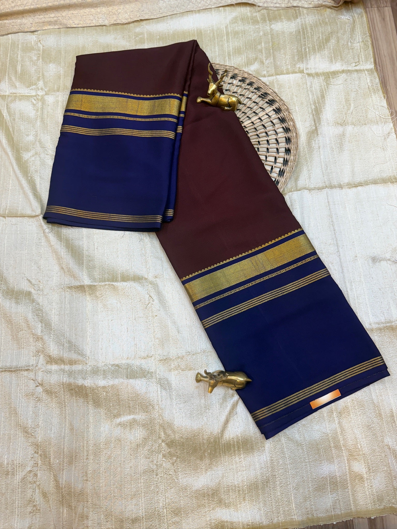 Pure Crepe Mysore Silk Saree 3D with Bentex Border | Brown with Navy Blue Border