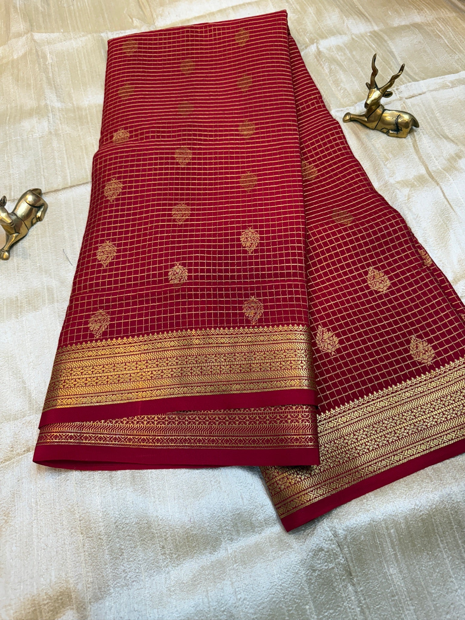 Pure Crepe Mysore Silk Saree | Checks design | Red