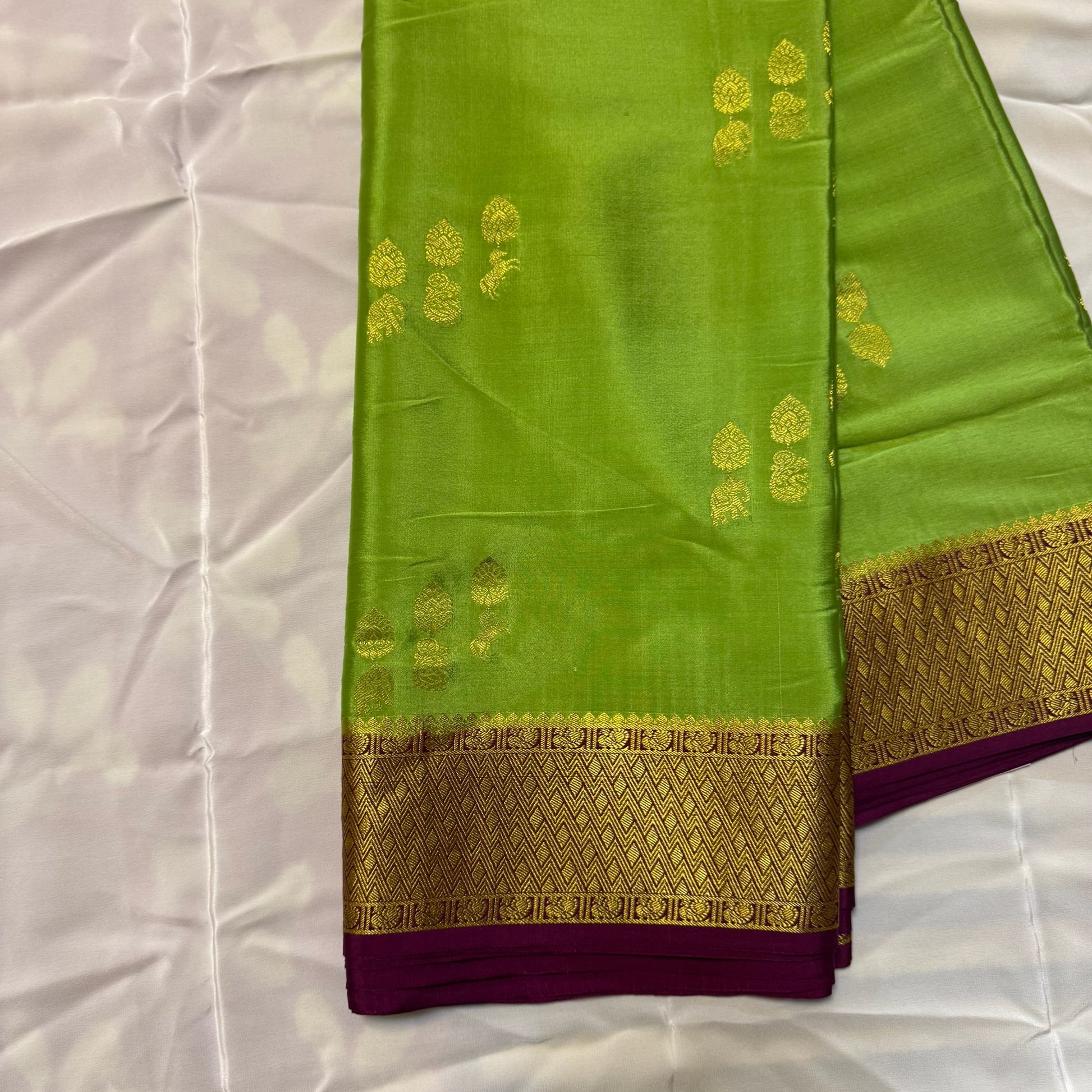Pure Crepe Mysore Silk Saree | Peacock, elephant, horse Butta | Mehendi Green