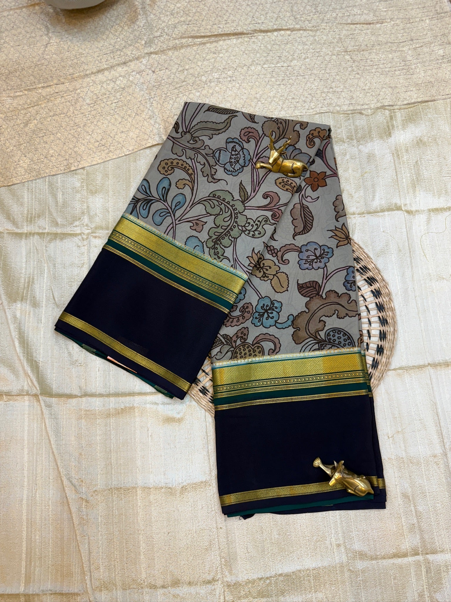Pure Crepe Mysore Silk Saree with Digital Print | Grey with Blue Border