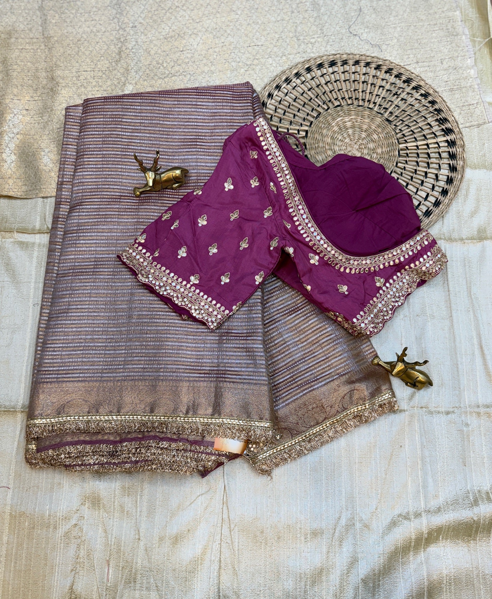 Pure Tissue Fancy Saree with Readymade Blouse | Pink with golden stripes