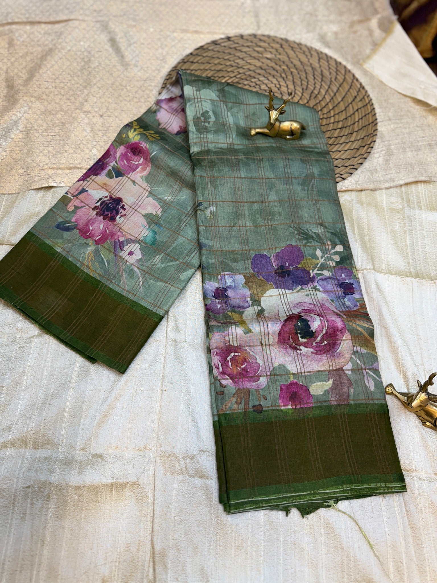 Pure Tusar Silk Saree with Big Floral design and Checks | Green